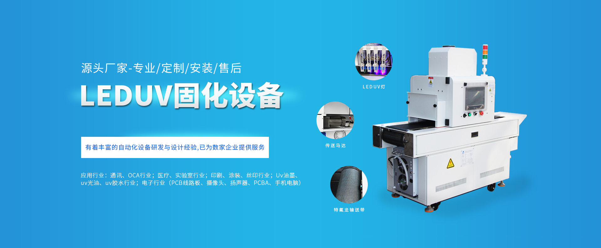 公司產(chǎn)品廣泛應(yīng)用于:塑膠五金涂裝、家具木器石材涂裝、印刷、噴繪上光、絲印移印、PCB、涂布等行業(yè),廣泛適用于各種:UV光油、UV油墨、UV油漆、UV膠水等多種類UV固化